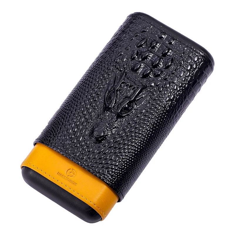 The ritual continues wherever you land. This dragon-embossed leather cigar travel case protects three sticks with wood-lined channels and a firm, zip-free slide fit. It’s compact, discreet, and engineered to keep shape in a briefcase or weekender. Black leather on the outside, clean wood tracks on the inside your cigars ride separate and secure.