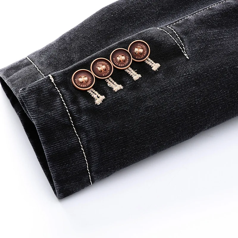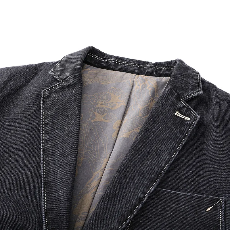 | Style | Casual blazer with notch lapel, contrast stitching and denim texture |