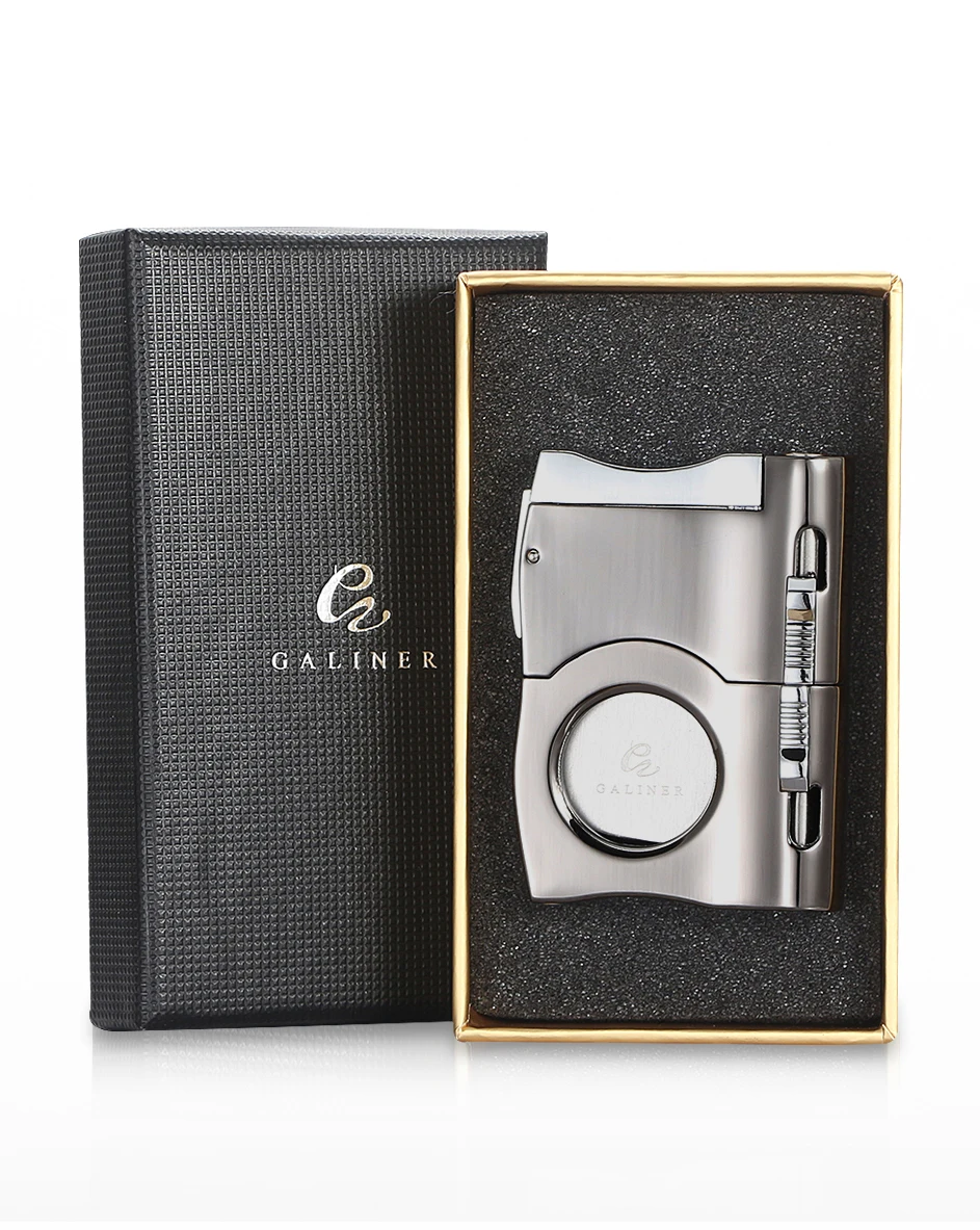 A solid stainless-steel body with locking blades travels safely in your blazer pocket or travel humidor. The gun-grey finish is understated and purposeful—presence without noise.