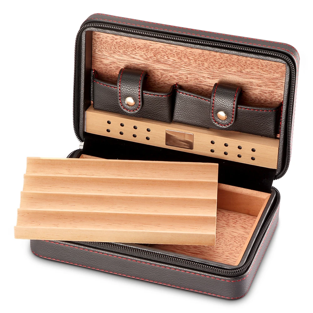 A removable cedar tray cradles up to 4 cigars (≈60 ring max). Cedar stabilizes moisture and rounds the aroma while preventing flavor cross-over. Vented panels accept a humidifier pack to keep the box in the ideal 65–70% RH range on the move.
